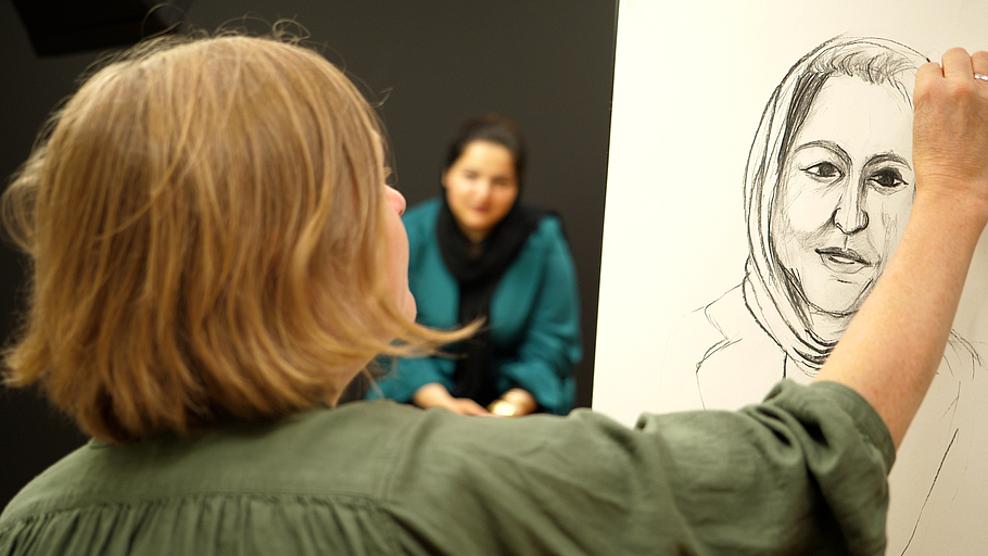Aus politischen, religiösen und kulturellen Gründen bat die Familie darum, ihre Persönlichkeiten so weit zu schützen, dass die Gesichter und die Stimmen nicht direkt erkennbar sind. Die Kameras nähern sich aus diesem Grund nur indirekt den Portraitierten, der Fokus liegt auf der entstehenden Zeichnung und der Betrachter bekommt ein Abbild der Person durch den subjektiven Blick der Künstlerin vermittelt.