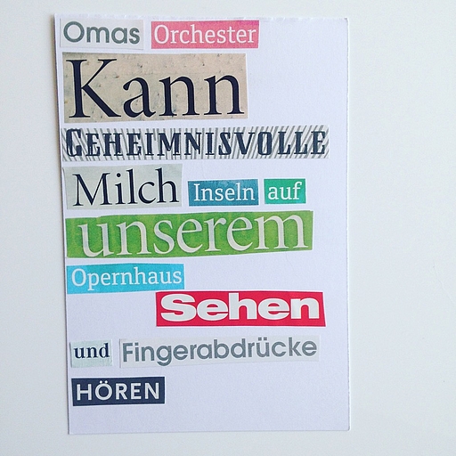 Der Zufall spielt mit, wenn gemeinsam mit der Autorin Carmen Winter Textcollagen gestaltet werden. Aus Zeitungen und Zeitschriften ausgeschnittene Wörter werden neu gemischt und zu Texten kombiniert, die inhaltlich und formal überraschen.
