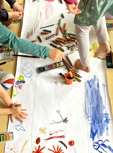 Wir tanzen durch Farbe, verwandeln uns zu beflügelten Insekten und gestalten auf einem großen Blatt am Boden eine bunte Wiese als unsere Startbahn. Gemeinsam heben wir ab – ein lebendiges Gemeinschaftsbild voller Fantasie, Klang und Bewegung entsteht.
