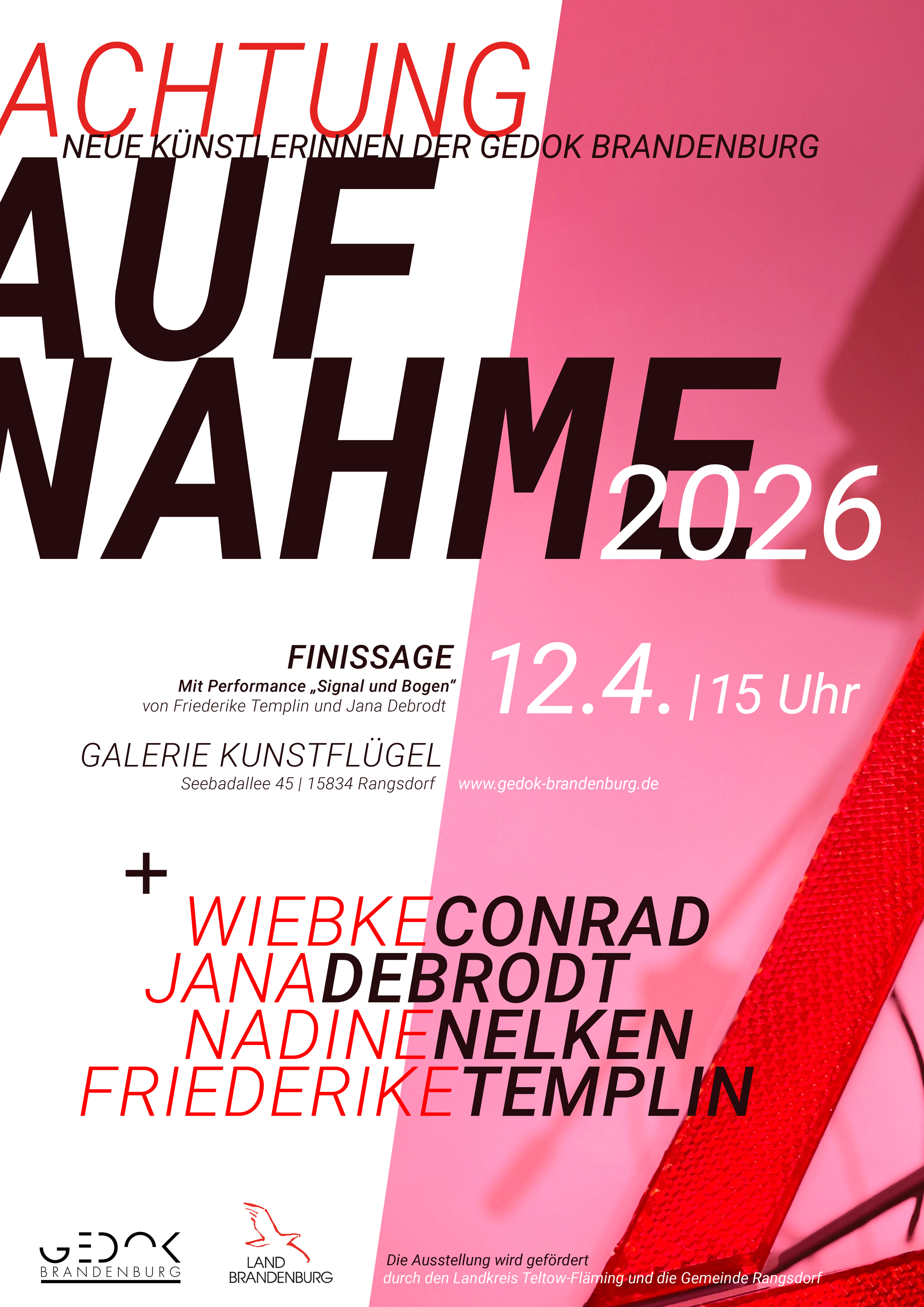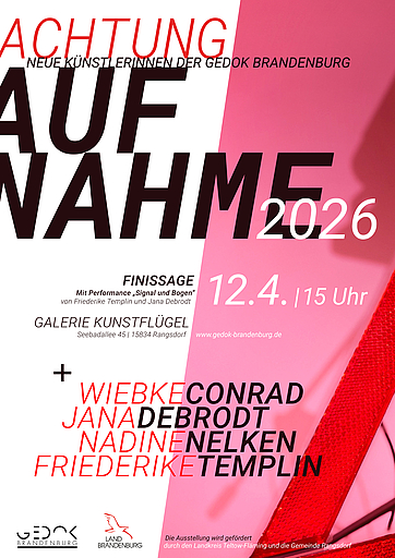 Zum feierlichen Abschluss der Ausstellung lädt die GEDOK Brandenburg herzlich in die Galerie KUNSTFLÜGEL Rangsdorf ein. Am 12. April 2026 um 15 Uhr erwartet die Besucher*innen ein besonderer Höhepunkt: die Performance „Signal und Bogen“ von Friederike Templin und Jana Debrodt.