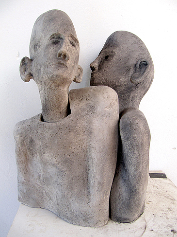 Eckerlin spürt in ihren Terrakotta-Skulpturen dem Verhältnis des Einzelnen zu seinem Gegenüber oder der begrenzten Gemeinschaft im gesellschaftlichen Raum nach. Ist diese Gemeinschaft frei gewählt oder auferlegt? Aus Not oder aus Überforderung? Instrumentalisiert oder von Gott gegeben? Geben die Menschen sich gegenseitig Halt? Hilfe? Wärme? Schutz? Es ist immer wieder ein Versuch, den Menschen in seinem Dasein, in seiner Verletzbarkeit, zu rekonstruieren. Die hermetischen und massiven Formen, hohl aufgebaut, lassen bei genauerer Betrachtung Risse und Öffnungen erkennen. Die Schwere und die Robustheit der Körper werden zur lllusion.