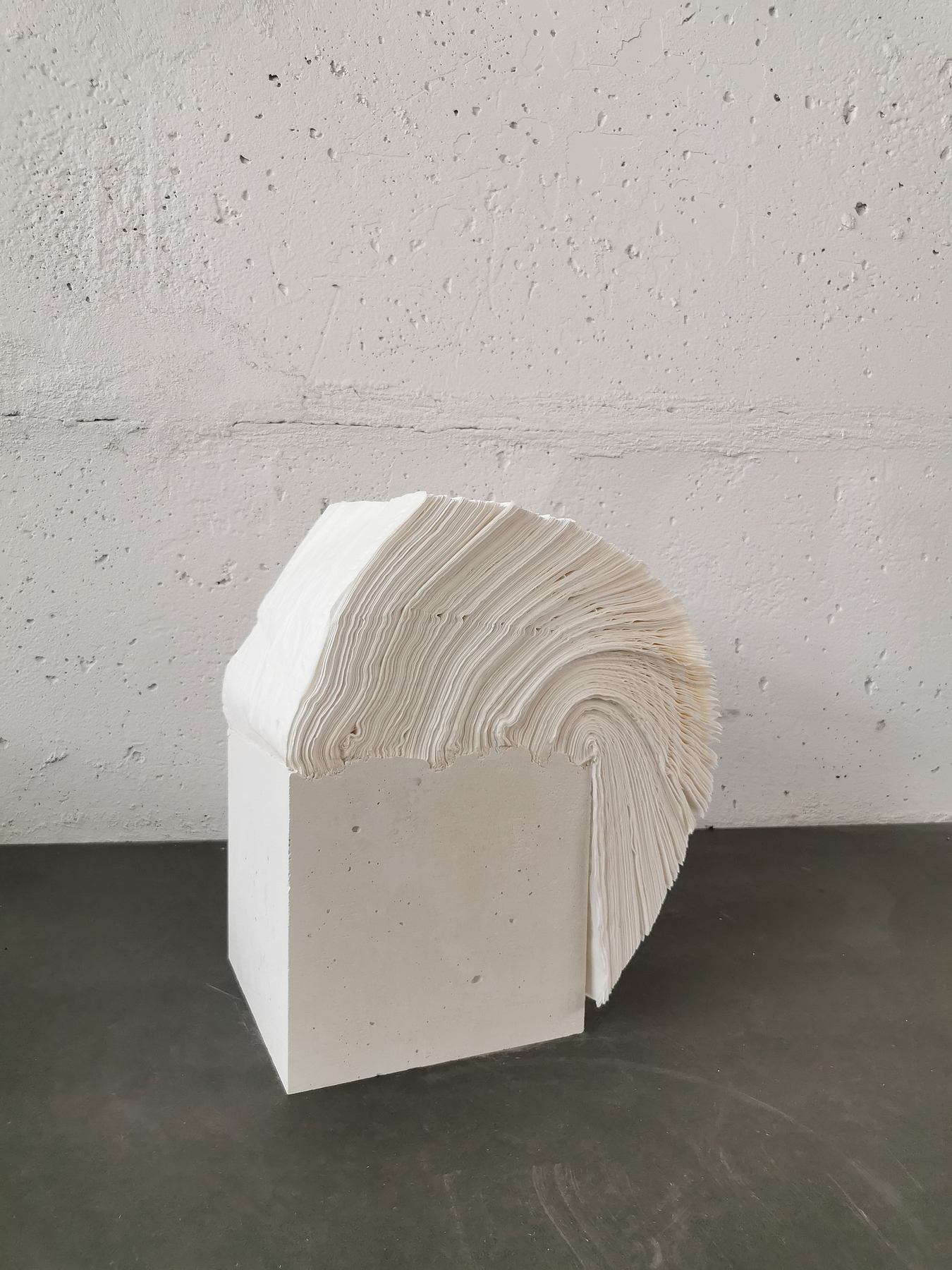 In ihrer Werkfolge „Hybride Heimat“ widmet sich Ines Schaikowski der Bedeutung des vielfach aufgeladenen Begriffs Heimat. Die aus Wriezen stammende Künstlerin hat ihr Studium in Marburg, Weimar, Girona und Barcelona absolviert und in Deutschland, Japan und Spanien gearbeitet, so dass die Auseinandersetzung zwangsläufig auch Fragen nach der eigenen Standortbestimmung aufwirft. Nach ihrem Verständnis ist Heimat Gegenstand gesellschaftlicher wie auch individueller Aushandlungsprozesse, die zwischen Bekanntem und Unbekanntem, dem Eigenen und dem Fremden oszillieren und damit die gesetzten Grenzen immer wieder verschieben. Ines Schaikowski gießt Beton um Alltagsgegenstände wie Wäscheklammern, Strohhalme, Müllsäcke oder Bücher und kreiert Installationen, die Altbekanntes in einen neuen Kontext versetzen, der sie ihrer Funktion beraubt und sie gleichzeitig als Teil eines Kunstwerks aufwertet. Dinge werden verschluckt, treten hervor, werden überlagert und eingepasst und eröffnen den Blick auf neue Möglichkeiten und Zusammenhänge.