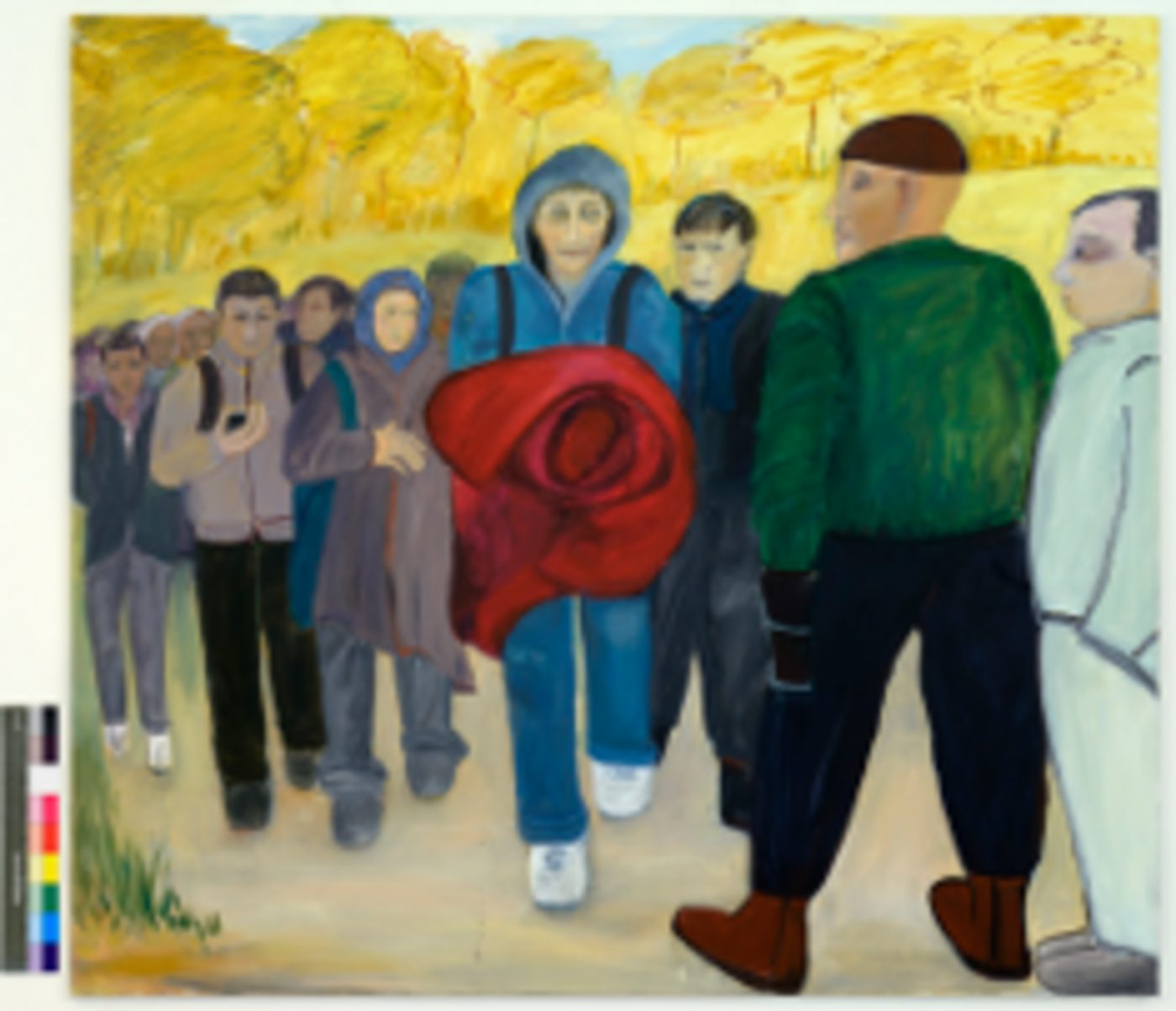 „Meine künstlerischen Arbeiten beziehen sich immer auf eigenes Erleben oder Ereignisse im öffentlichen Raum.“ Flucht vor Elend und Gewalt, so Irmgard Merkens, gebe es seit biblischen Zeiten. Dennoch schien bisher das derzeitige Ausmaß im 21. Jahrhundert unvorstellbar. Deshalb lege die Malerin ihrer künstlerischen Arbeit dieses Thema für die nächste Zeit zu Grunde. Die Künstlerin bezieht sich auf das Jahresthema 2016 der GEDOK Brandenburg, das „Aufbruch“ heißt. „Aufbruch und Erwartung sind ein Wortpaar, das sich inhaltlich zusammenfügt und mich bewogen hat, mich für diese Ausstellung in Rangsdorf zu bewerben“ erklärt Irmgard Merkens, die die Kraft der Farben meisterhaft einsetzt.